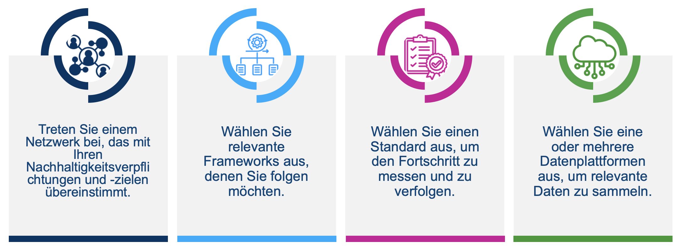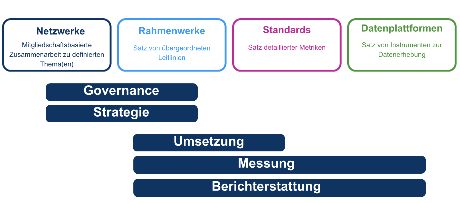 Datenplattformen, Frameworks, Netzwerke und Standards sind verschiedene Instrumente, die Vermögensverwaltern, Vermögensinhabern, Finanzinstituten und anderen Finanzakteuren zur Verfügung stehen. Einige von ihnen bieten kollaborative Unterstützung und Leitlinien, um die Integration von Umwelt-, Sozial- und Governance-Kriterien (ESG) in der gesamten Organisation und im Investitionsprozess zu erleichtern. Andere helfen dabei, auf wissenschaftlichen Daten basierende Messungen und Berichte zu erstellen. Die folgende Grafik zeigt, wie diese Instrumente genutzt werden können.