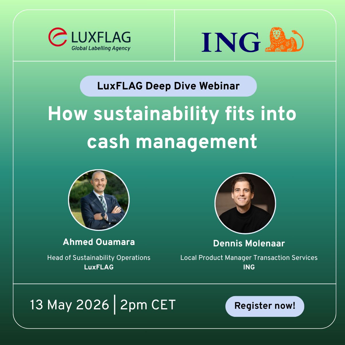 This webinar, organised by LuxFLAG in collaboration with ING Luxembourg, will explore how sustainability can be integrated into cash management solutions through the ING Green Referenced Account, examining its alignment with ESG standards and its role in channeling liquidity toward green assets and sustainable finance objectives.