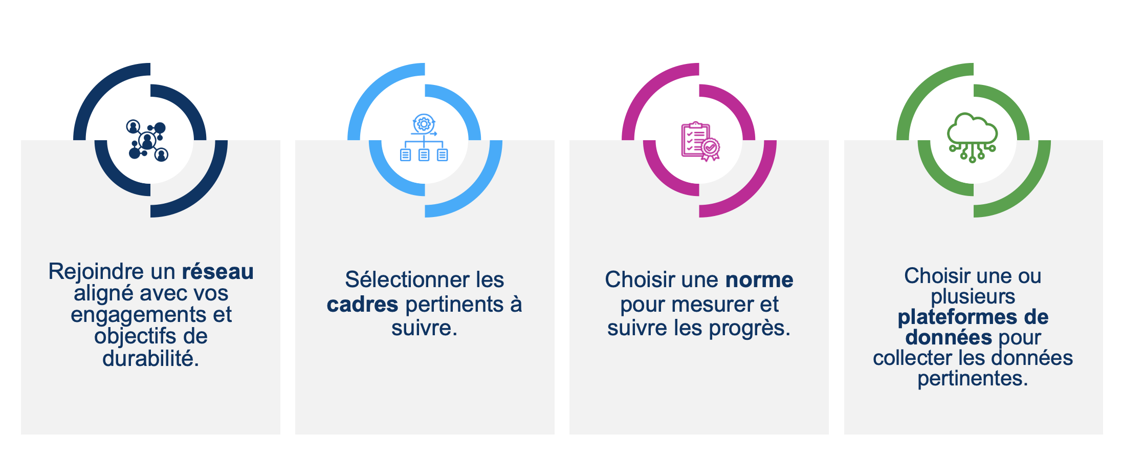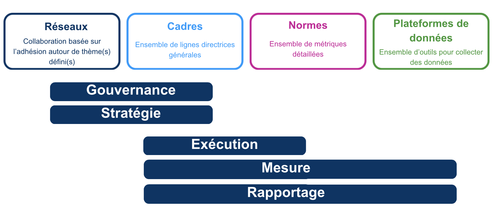 Les plateformes de données, cadres, réseaux et normes sont différents instruments à la disposition des gestionnaires d’actifs, propriétaires d’actifs, institutions financières et autres acteurs financiers. Certains offrent un soutien collaboratif et des orientations pour faciliter l’intégration des critères Environnementaux, Sociaux et de Gouvernance (ESG) au sein de l’organisation et dans le processus d’investissement. D’autres aident à mesurer et à rapporter en s’appuyant sur des données scientifiques. Le tableau ci-dessous montre comment utiliser ces instruments.