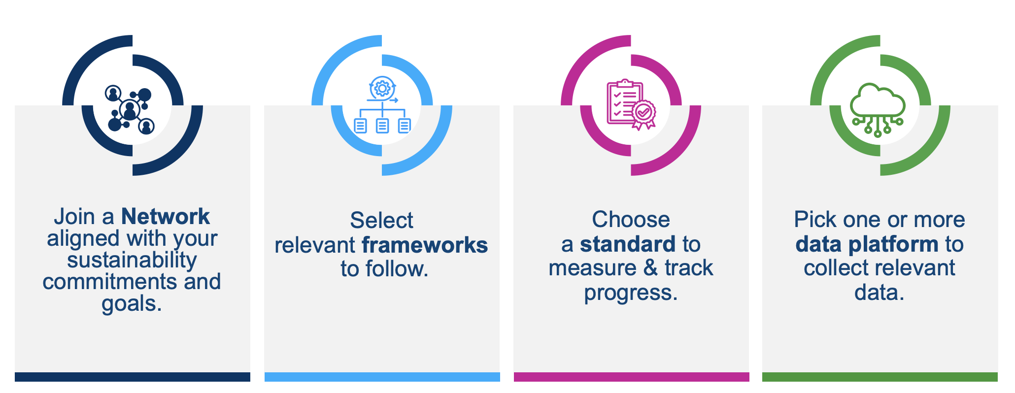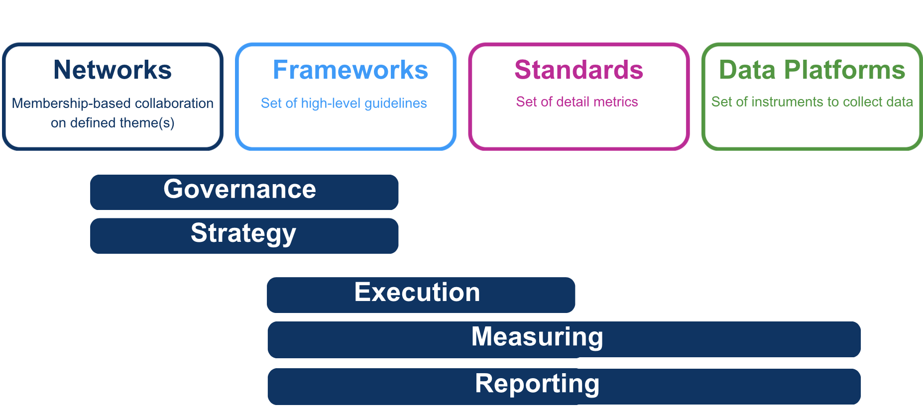 Data Platforms, Frameworks, Networks and Standards are different instruments available for asset managers, asset owners, financial institutions and other financial actors. Some of them provide collaborative support and guidance to facilitate the integration of Environmental, Social and Governance criteria across the organisation and the investment process. Others help measure and report using science-based data. The chart below shows how to use these instruments.