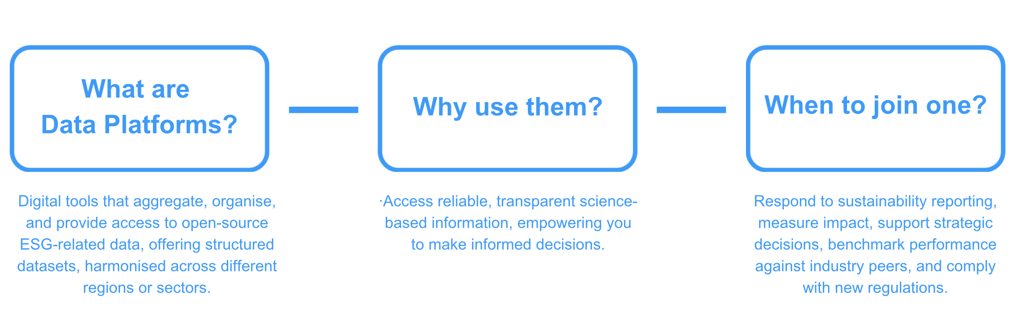 Explore the key data platforms that provide science-based, comparable, and harmonised open-source datasets. The image below provides an overview of these, explaining what they are, as well as when and why to use them. In the table, you can filter by platform type, target audience, themes, and industries or sectors, or search directly using keywords. For the best experience, we recommend accessing this page on a laptop and viewing it in full-screen mode.
